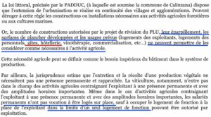 Seul l’article L. 121-10 peut permettre une dérogation si la construction est nécessaire à l’activité agricole et en dehors des EPR (Espaces proches du rivage). Or l’activité viticole ne nécessite pas la présence permanente de l’exploitant ou de ses salariés sur le siège de son exploitation.