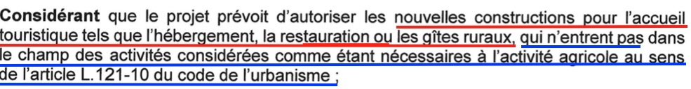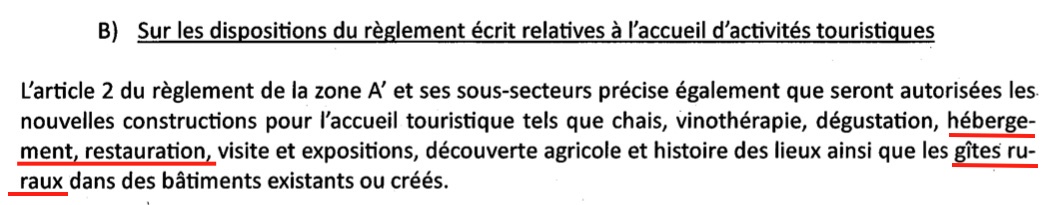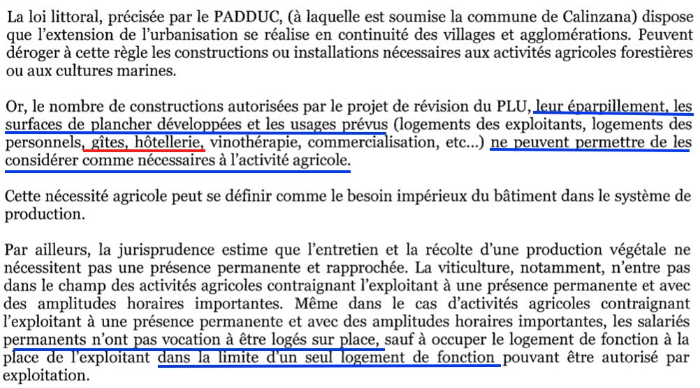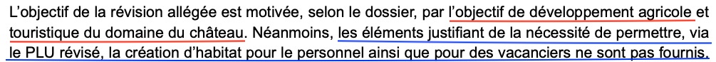 A – Les parties des citations d’une révision du PLU ficelée pour un projet touristique sont soulignées en rouge, celles pointant l’illégalité de la majorité des nouvelles constructions sont soulignées en bleu.