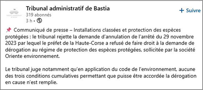 Le communiqué du Tribunal administratif de Bastia :