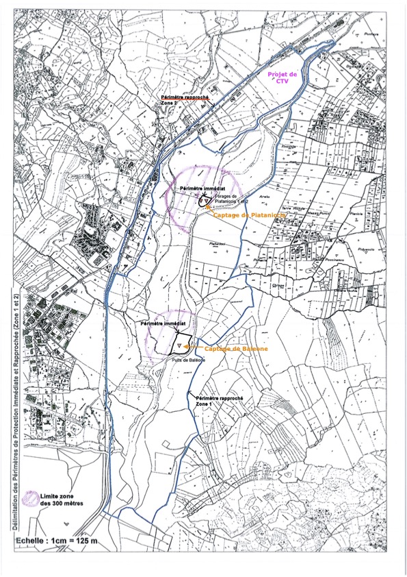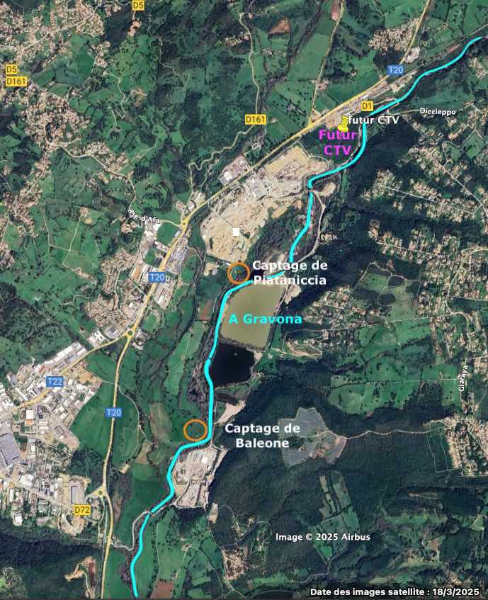 La parcelle support du projet de construction d’un Centre de Tri et de Valorisation des déchets (CTV) de la même CAPA est située à deux pas de la gare de Mezzana, au nord des 2 forages “de Piataniccia” et “de Baléone”, dans la “zone 2” du périmètre de protection rapproché (voir photographie et carte ci-dessous)… et en bordure de la Gravona.