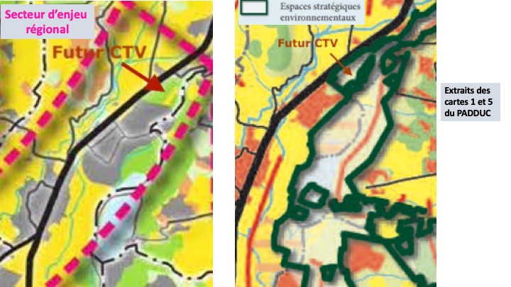 - au sein d’un Espace Stratégique Environnemental (ESE) du PADDUC (carte n°5), espaces qui présentent des enjeux de biodiversité relevant d’une logique d’intervention prioritaire au sein d’un réservoir de biodiversité en référence aux documents de la Trame Verte et Bleue.