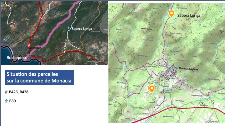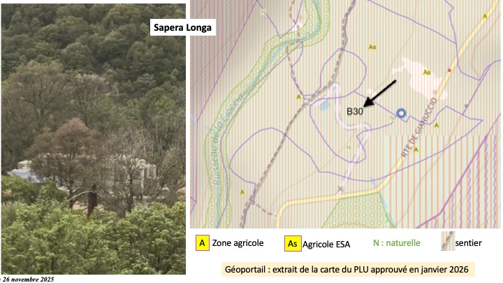 Au lieu-dit Sapera Longa, une construction est en cours sur la parcelle B30, dans un secteur totalement isolé, qui était couvert de maquis mais qui est aujourd’hui fortement dégradé. À notre connaissance, aucun permis de construire n’a été rendu public pour cette parcelle qui est un ESA sur le PADDUC ((voir illustration ci-dessus). La CTPENAF n’a pas été saisie. Sur le PLU approuvé, cette parcelle est en zonage N (Naturelle) et elle est entourée de terres agricoles voire stratégiques agricoles. Les règles d’urbanisme ne sont pas facultatives et la construction en site naturel isolé est strictement encadrée.