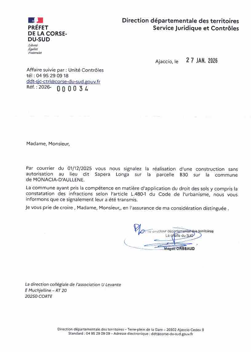 - Saisie par l’association, la DDT a renvoyé la responsabilité d’interruption des travaux au maire de Monacia d’Auddè (cf. lettre en pj).