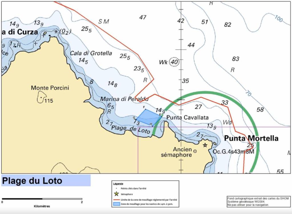 L’arrêté du Préfet maritime de Méditerranée daté du 18 mai 2021 avait déjà annoncé une zone de mouillage face à la plage du Lotu (quadrilatère bleu sur l’image ci-dessous) mais pas celle du Fiume Santu.