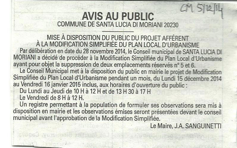 Santa Lucia di Moriani. PLU. Du 15 décembre au 16 janvier 2015.