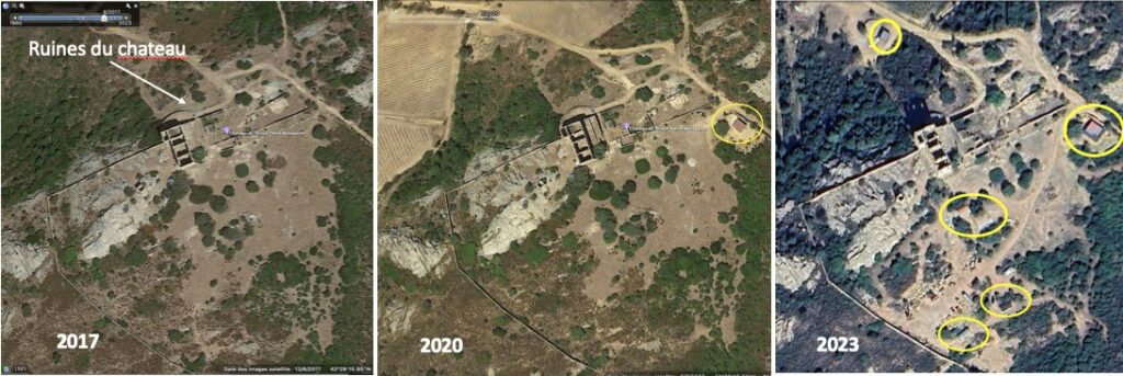 Images Google Earth de 2017, 2020 et 2023 de la zone des ruines du chateau :